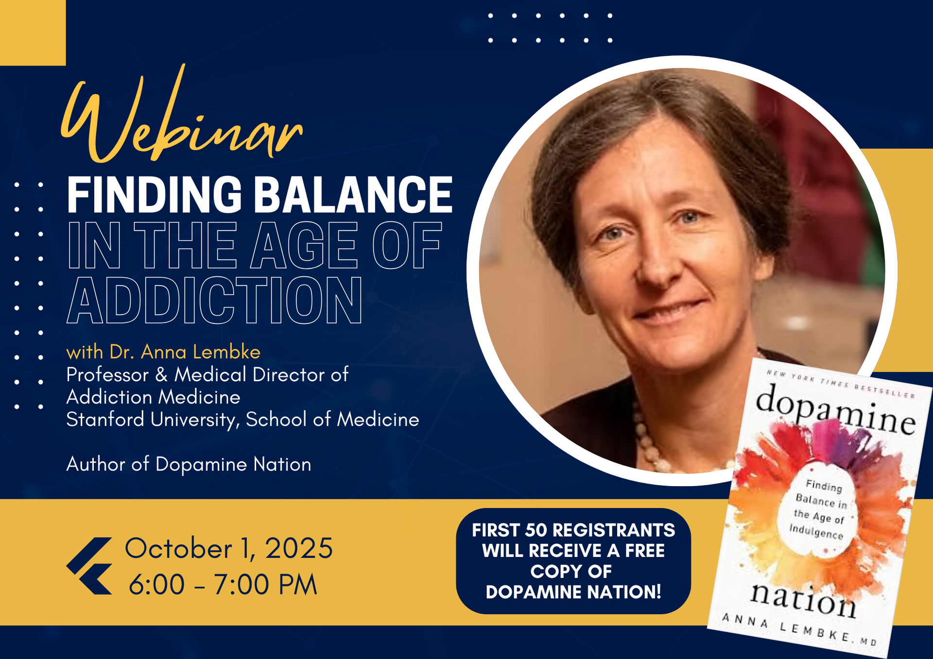 The webinar will feature Dr. Anna Lembke, Professor and Medical Director of Addiction Medicine at Stanford University School of Medicine. A nationally recognized expert in the field of addiction, Dr. Lembke is the author of Drug Dealer, MD and the bestselling Dopamine Nation: Finding Balance in the Age of Indulgence. She also appeared in the Netflix documentary The Social Dilemma.